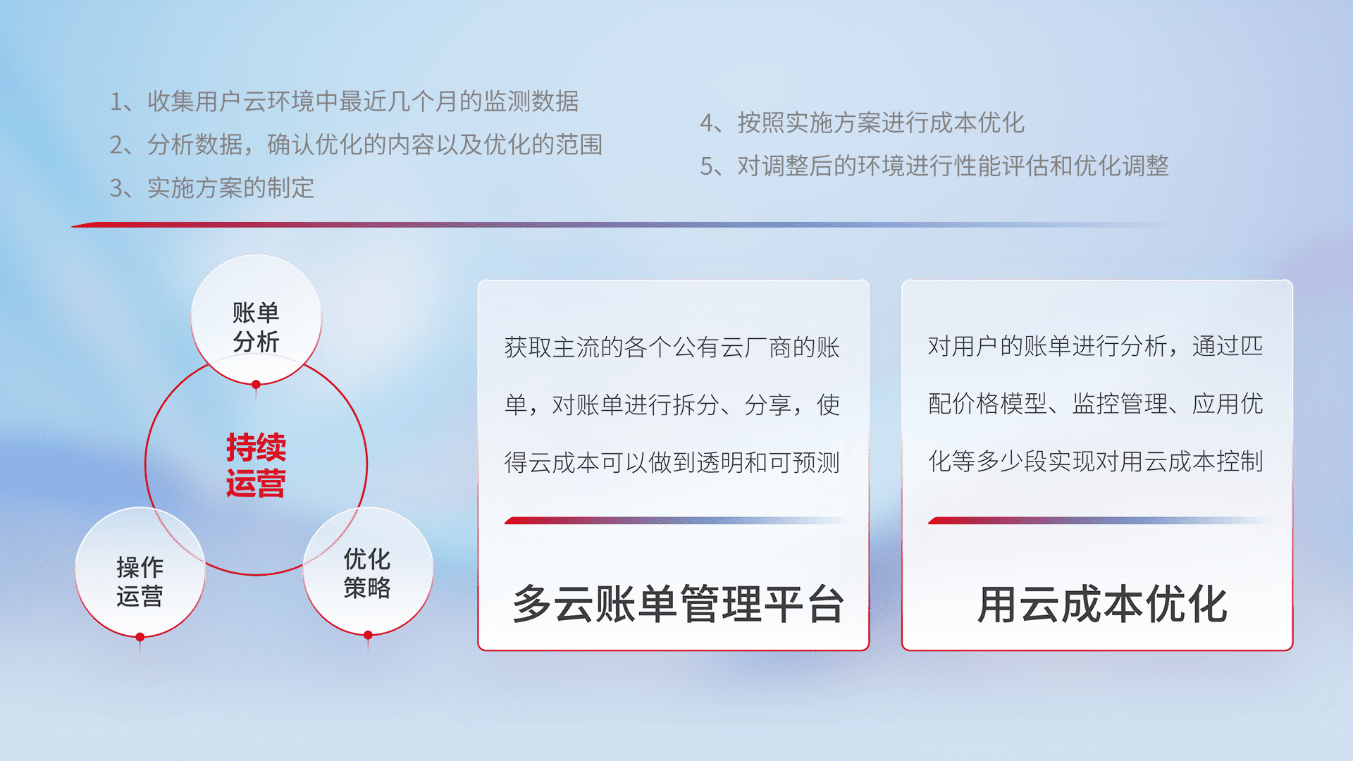 通过多云纳管,,,以统一的资源数据模型把客户的云资源进行抽象和封装,,,,进而实现对多云资源的统一操作,,保障云资源管理的可靠性、、稳定性与可用性。。量身定制化运维内容,,配置、、、开发运维、、、、补丁管理、、、、备份、、、监控、、、、认证和访问管理、、审计和日常巡检等,,保障在用云过程中的可靠度,,,,稳定度以及高可用率。。